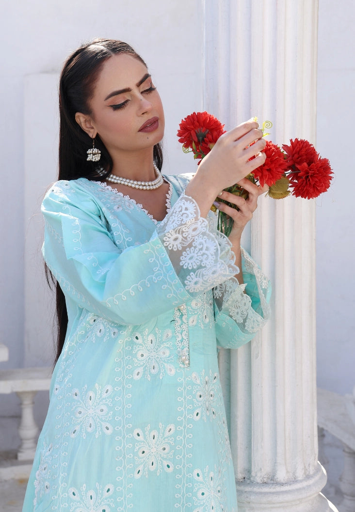 The fully embroidered shirt features intricate white embroidery spread beautifully across the front, complemented by delicately embroidered sleeves for a refined finish. The soothing aqua blue color adds freshness and sophistication, making it perfect for daytime events, festive gatherings, and summer celebrations.