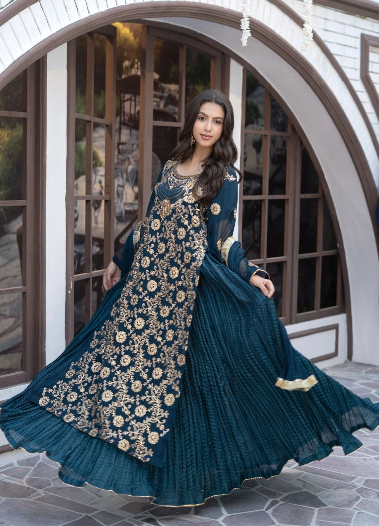 This Pakistani embroidered chiffon dress is ideal for women who love luxury festive outfits, party wear suits, and traditional Pakistani clothing online. Flaunt your elegance and charm with this timeless teal blue masterpiece. 🌙