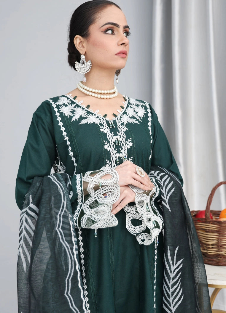 This graceful bottle green 3-piece suit showcases timeless elegance blended with classic Pakistani craftsmanship. The winter cotton shirt is beautifully adorned with intricate white embroidery on the neckline, sleeves, and hem, creating a rich contrast and a refined festive look. The straight-cut silhouette with detailed borders adds sophistication while ensuring comfortable winter wear.