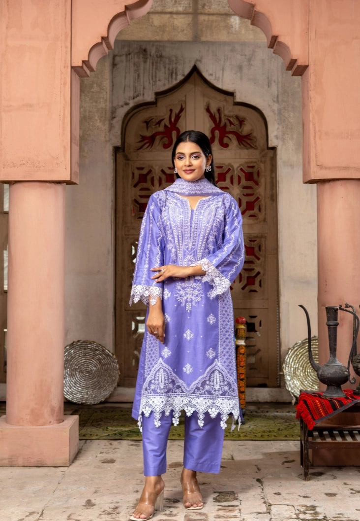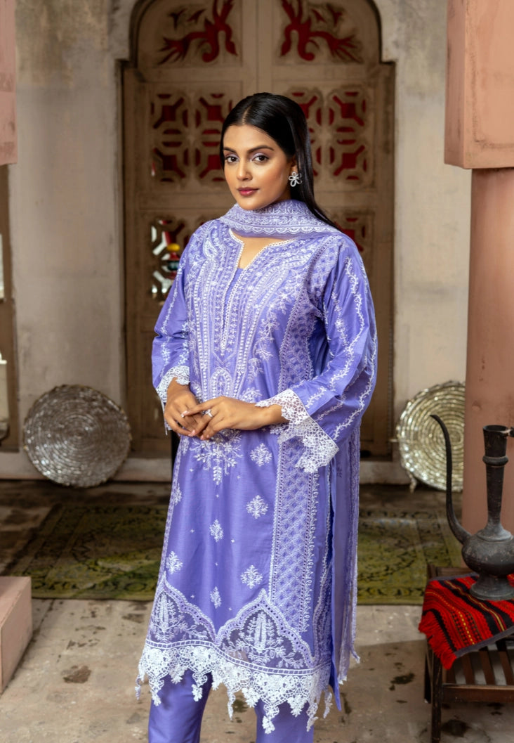 Step into a world of grace with the Lavender Ethereal collection by Maryam Fashions. This premium lawn cotton set is meticulously designed with intricate white threadwork and shimmering sequins, making it an ideal choice for festive gatherings or elegant daytime events.