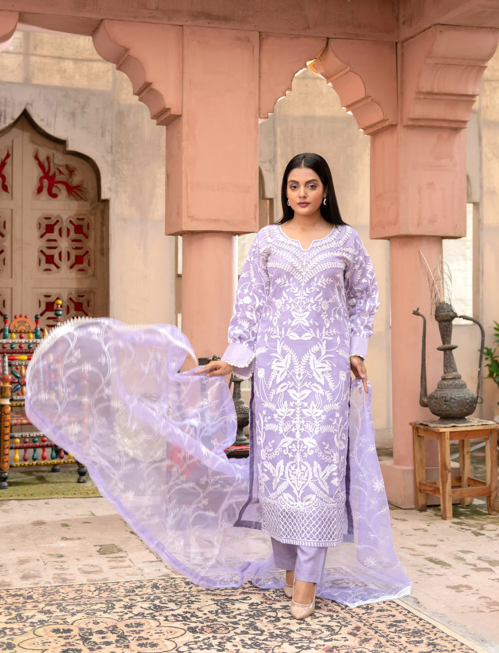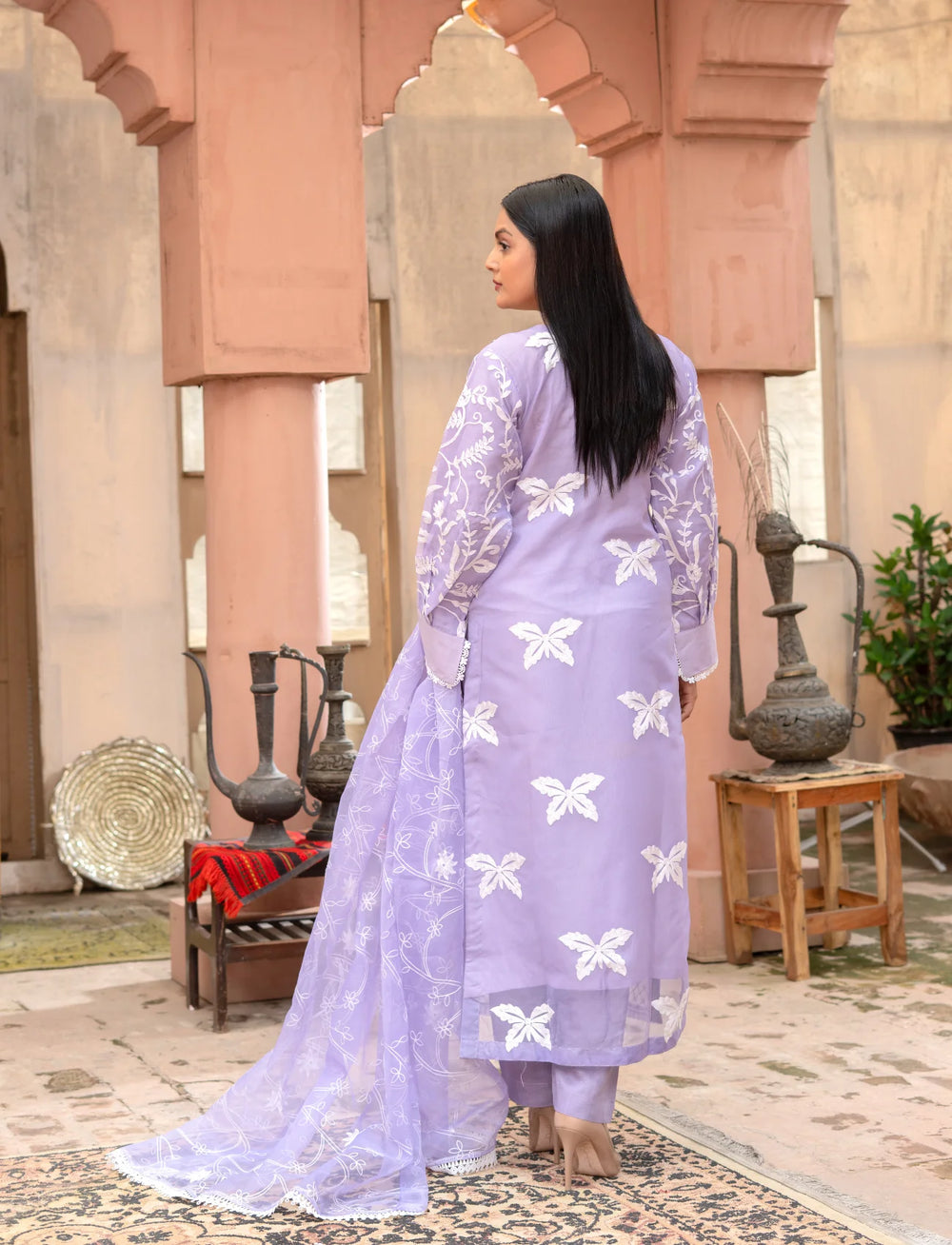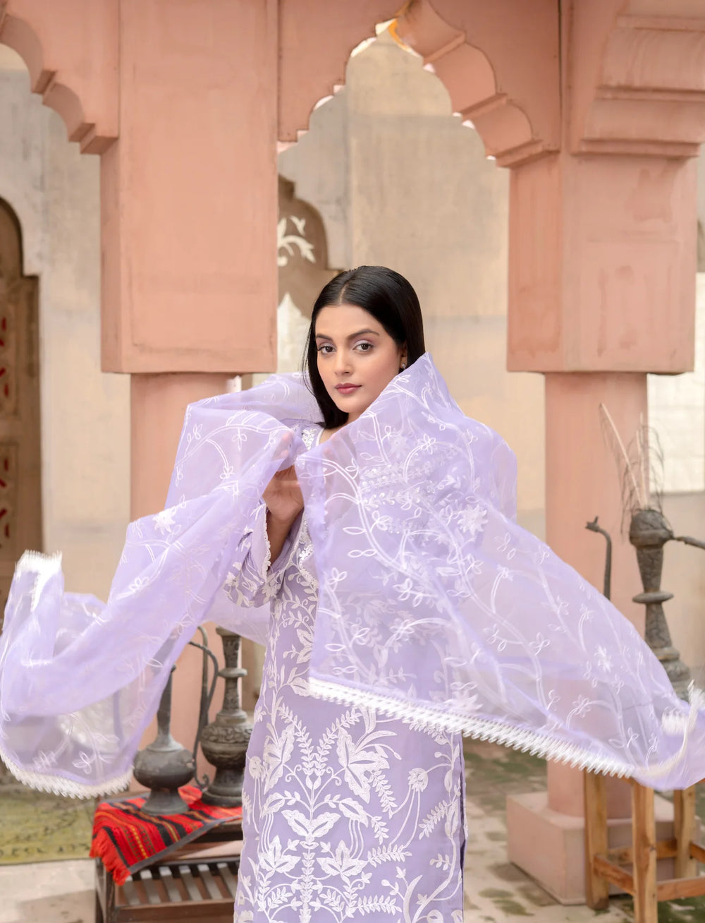 Grace meets sophistication in this Lilac Silver Organza Embroidered Suit, a perfect choice for women who love timeless festive wear. This 3PC stitched luxury outfit features a fully embroidered organza shirt with intricate detailing and a matching embroidered organza dupatta that enhances the charm of the ensemble.