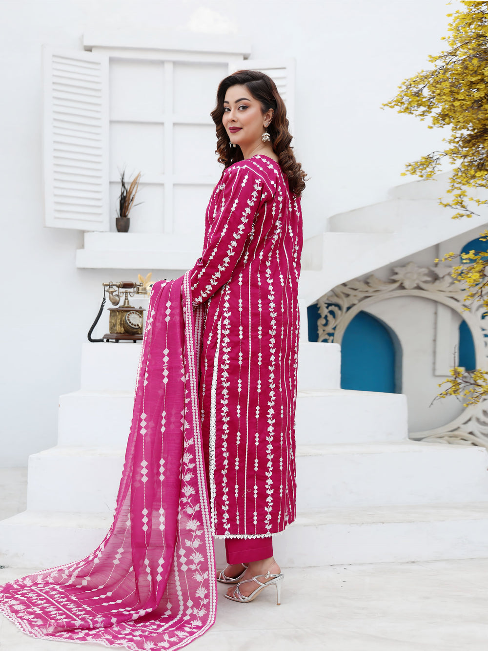 Step into pure elegance with this Premium Magenta Embroidered 3PC Suit, designed for women who adore classy festive fashion. The rich magenta shade combined with intricate white thread embroidery creates a beautifully balanced and sophisticated look. The long embroidered shirt is adorned with vertical floral patterns, giving a slimming and graceful silhouette.
