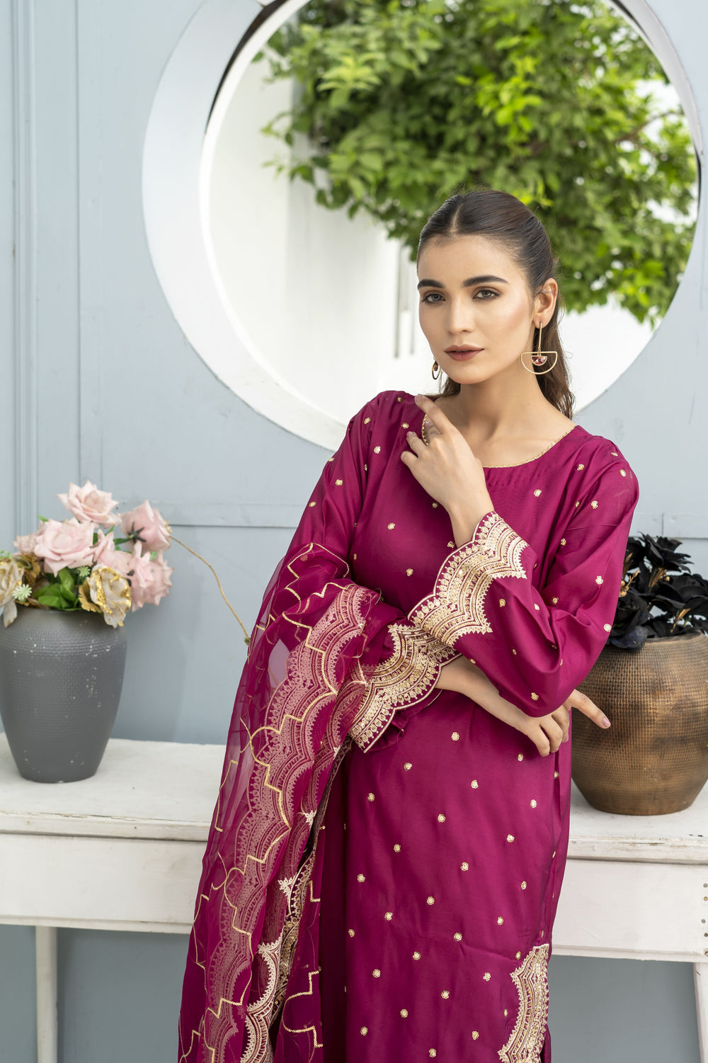 Indulge in luxury with this premium magenta embroidered 3-piece silk suit for women, designed to make you stand out this festive season. The silk shirt features exquisite gold thread embroidery with lace detailing on the sleeves and borders, creating an effortlessly elegant look. Paired with a matching silk trouser and a beautiful embroidered organza dupatta, this outfit perfectly blends sophistication and charm.