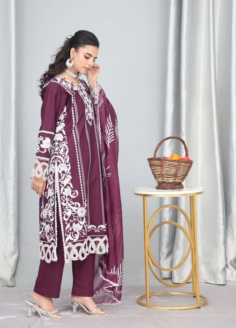 This stunning magenta 3-piece suit is a perfect blend of bold color and refined Pakistani craftsmanship. The winter cotton shirt is beautifully embellished with elegant white embroidery on the neckline, sleeves, and borders, creating a striking contrast against the rich magenta base. The straight silhouette with detailed finishing adds a graceful festive appeal while ensuring comfortable winter wear.