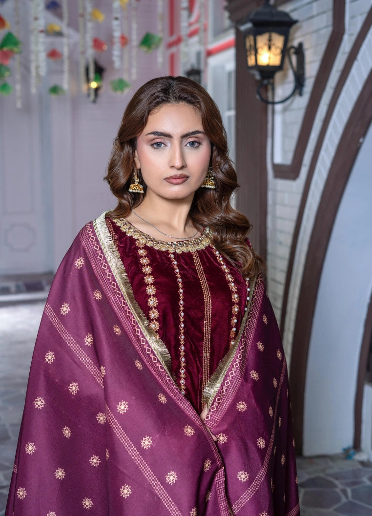 Luxury Mahroon Velvet Embroidered 3 Piece Suit – Ready to Wear Winter Festive Wear