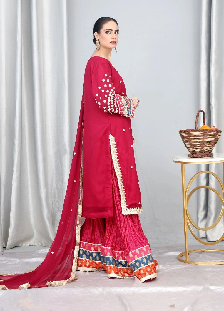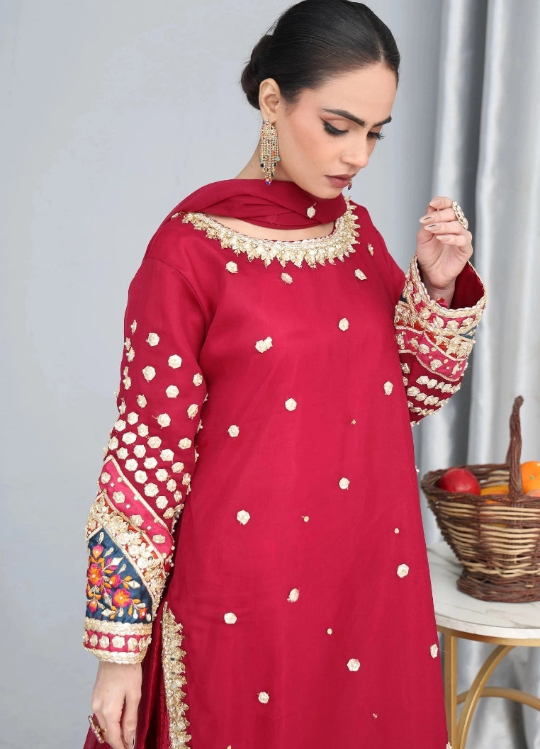 Designed for women who love bold, rich colors with refined detailing, this stitched suit is an ideal choice for weddings, mehndi events, Eid celebrations, and formal festive gatherings.
