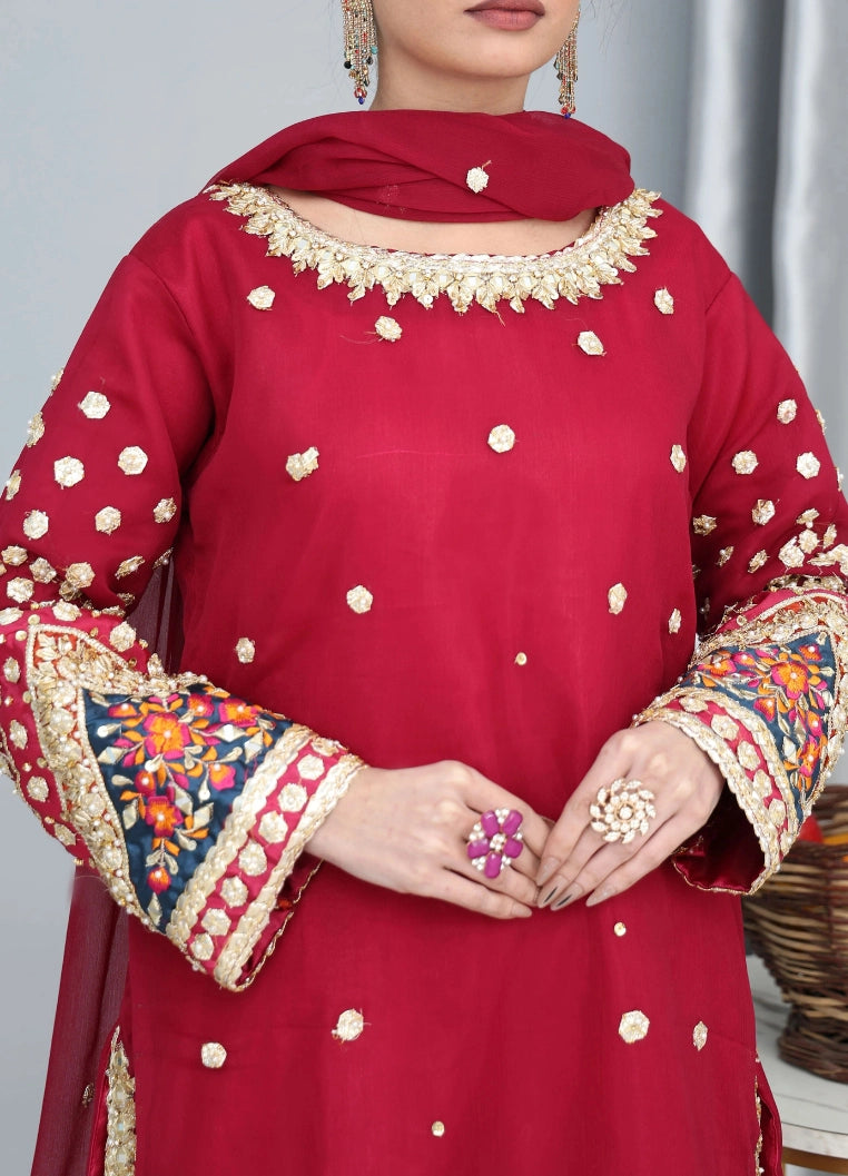 This exquisite mehroon 3-piece suit reflects rich elegance and timeless Pakistani craftsmanship. The chiffon shirt is beautifully detailed with delicate all-over embellishments, enhanced by a finely finished neckline and statement sleeves. The design is elevated with three different premium laces, adding depth, contrast, and a luxurious festive touch to the overall look.