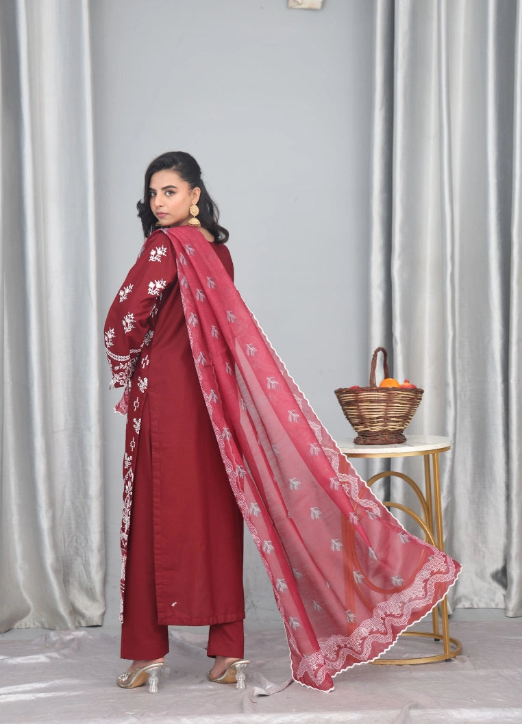 Paired with a comfortable winter cotton trouser, the suit offers warmth, ease, and a graceful structured fall, making it ideal for seasonal wear. The ensemble is completed with a digitally printed dupatta, designed with subtle patterns that perfectly complement the rich mehroon color and enhance the overall elegance.