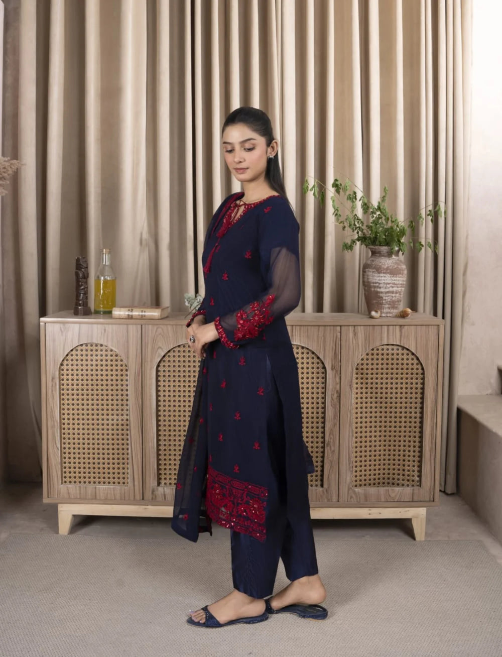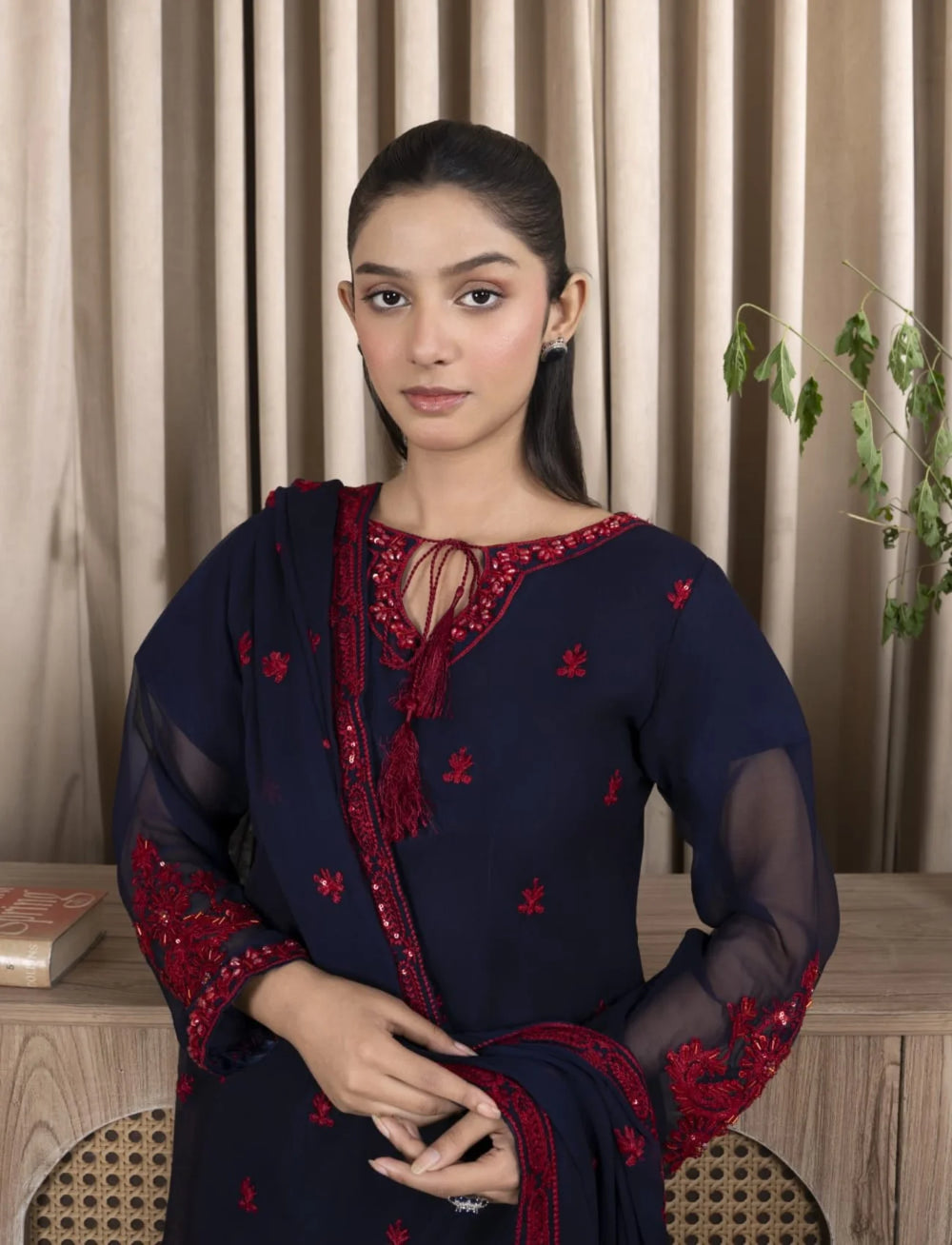 The Zarmina 3PC Chiffon Suit is designed with elegance and detail in mind. The shirt is fully embroidered, enhanced with embellished work on the neckline and sleeves. A soft silk inner ensures comfort, while the matching silk trouser completes the look. The chiffon dupatta is also fully embroidered, making this outfit a perfect choice for formal gatherings, festive evenings, and wedding events.