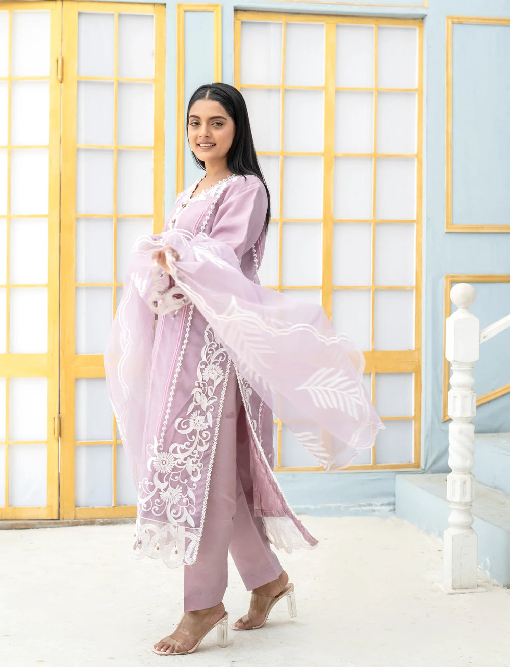 Step into elegance with this premium purple organza 3PC suit for women, a masterpiece from the latest Pakistani festive wear collection. The fully embroidered organza shirt with intricate lace neckline and sleeves creates a regal look, while the delicate organza dupatta with embroidery adds a graceful charm. Designed with a comfortable malai inner and paired with a stylish straight trouser, this stitched embroidered suit is the perfect blend of luxury and comfort.