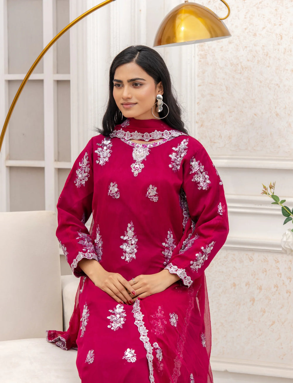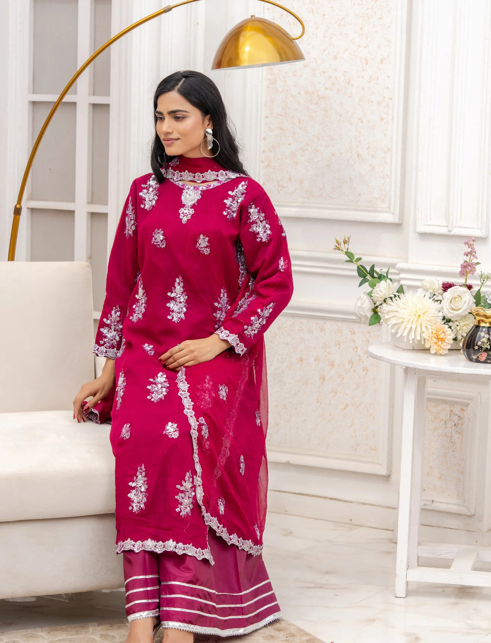 Bring glamour and festive charm to your wardrobe with this Shocking Pink Chiffon Embroidered 3PC Suit, crafted for women who love elegance with sparkle. The chiffon shirt is fully embroidered with delicate patterns, enhanced by heavy embellished work on the neckline and sleeves for a luxurious appeal. The matching embroidered chiffon dupatta adds grace, while the silk trouser completes the ensemble with refined sophistication. A soft malai inner ensures comfort for long wear.