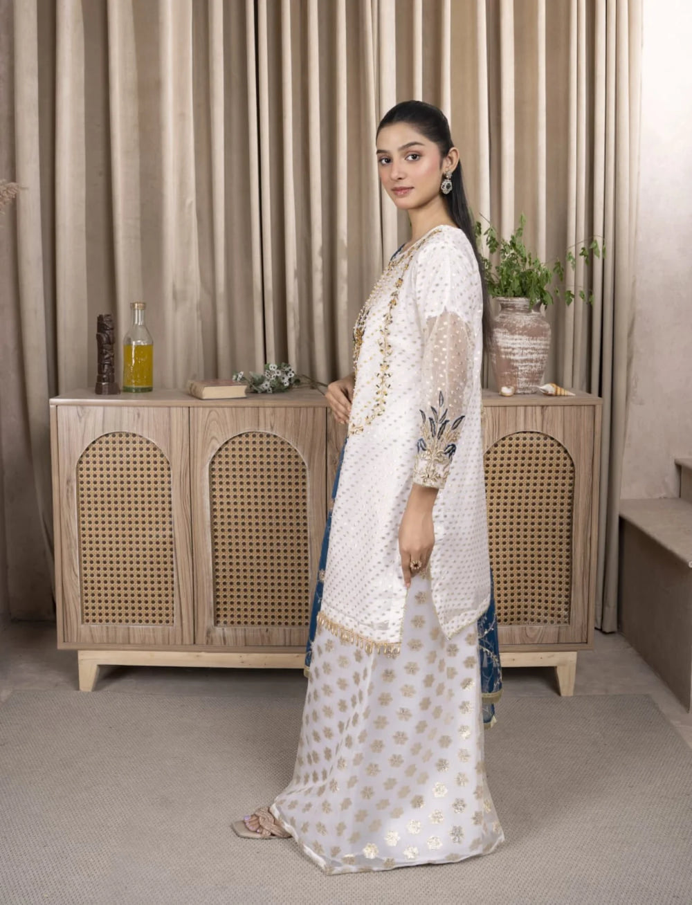The Hoor Embroidered 3PC Organza Suit is a perfect blend of elegance and sophistication. The fully embroidered organza shirt showcases intricate craftsmanship, while the delicate printed dupatta adds subtle charm. Paired with a foil-printed trouser enhanced with heavy embellished borders and a soft inner for comfort, this ensemble is designed to shine at every gathering.
